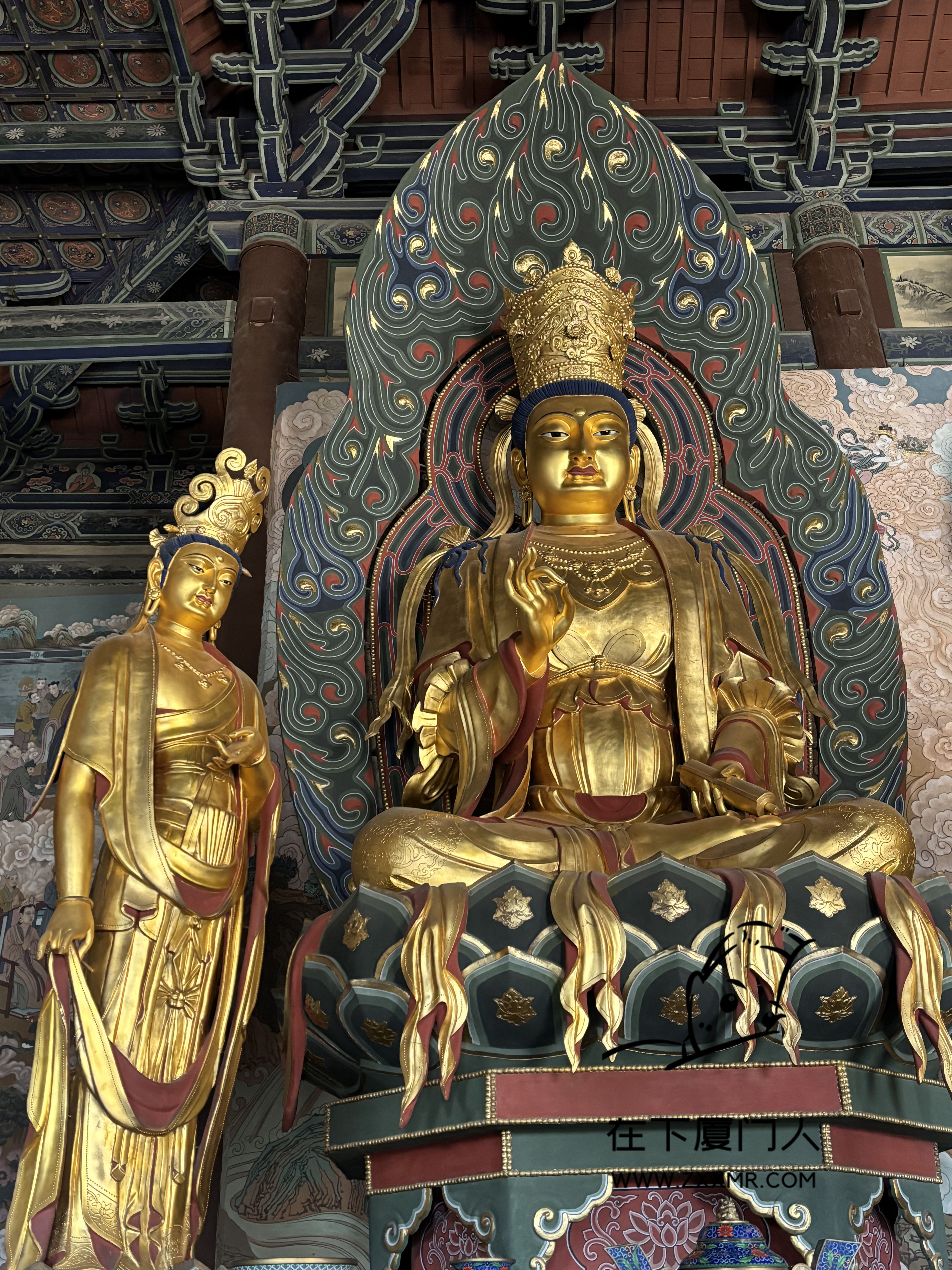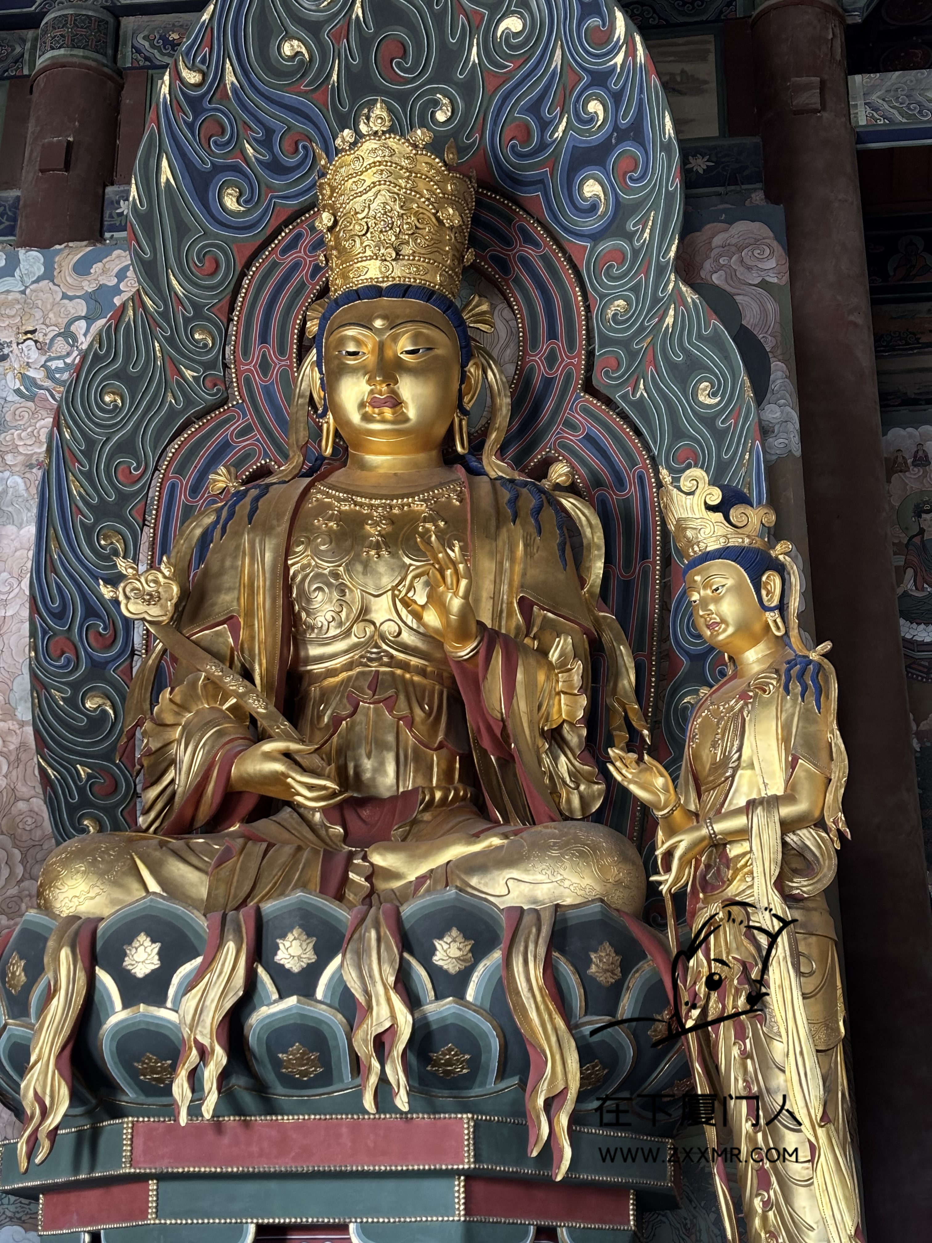 华严三圣,在佛教的华严三圣的组合中,一般形制都是文殊菩萨在佛陀主尊的左侧(东),普贤菩萨在佛陀主尊的右侧(西)。