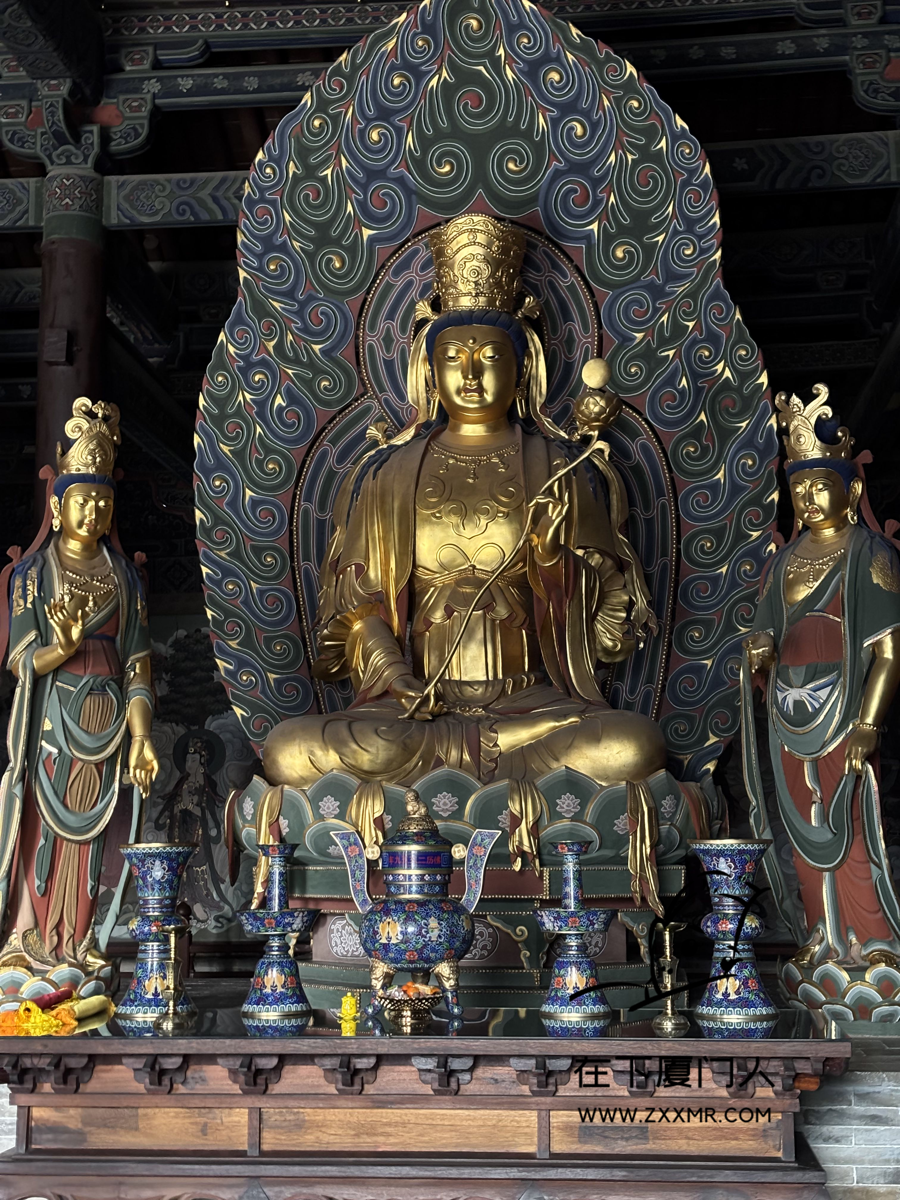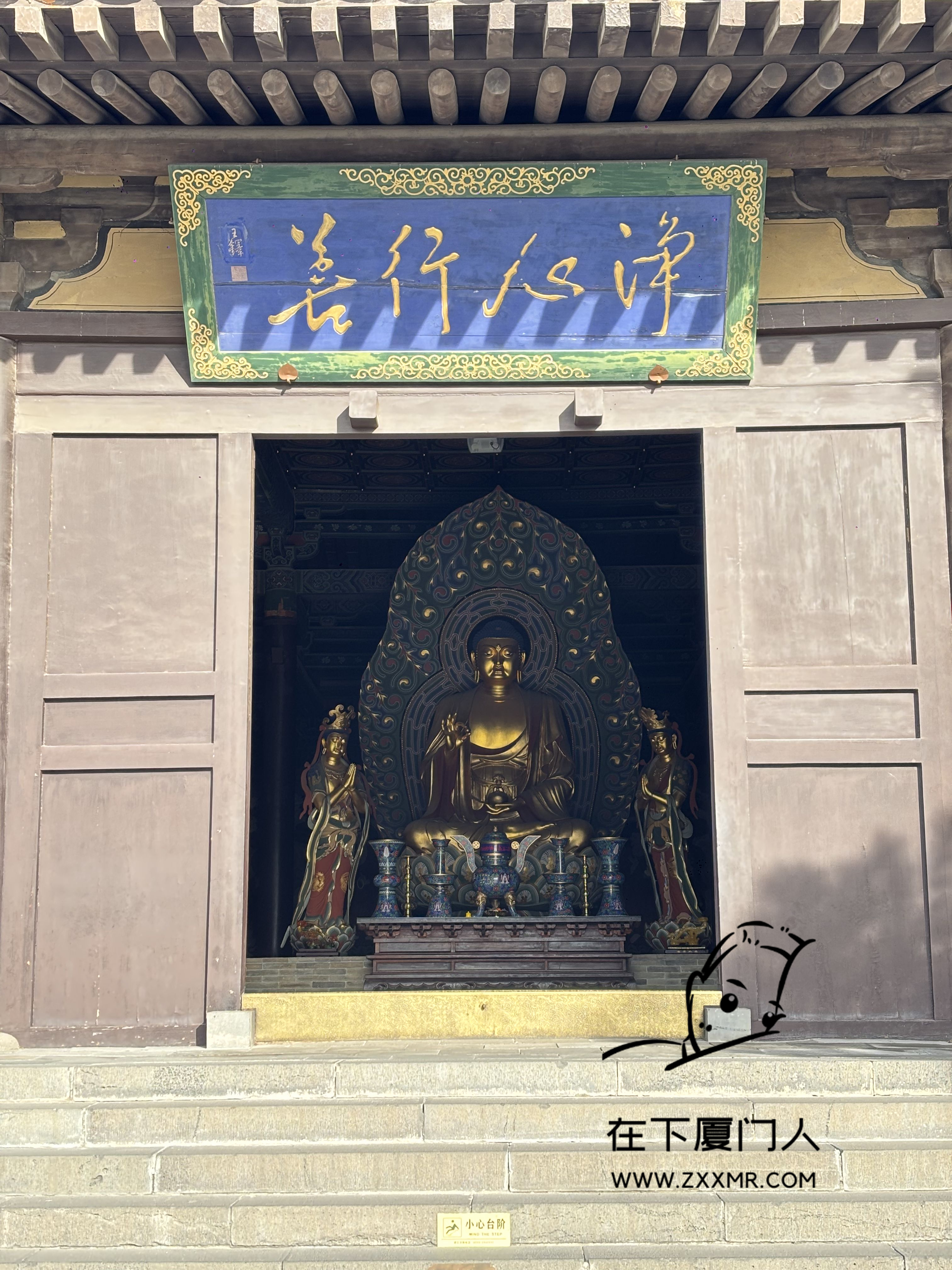 华严寺药师殿门口的“净心行善”匾额,药师殿中间的是东方净琉璃世界药师佛。