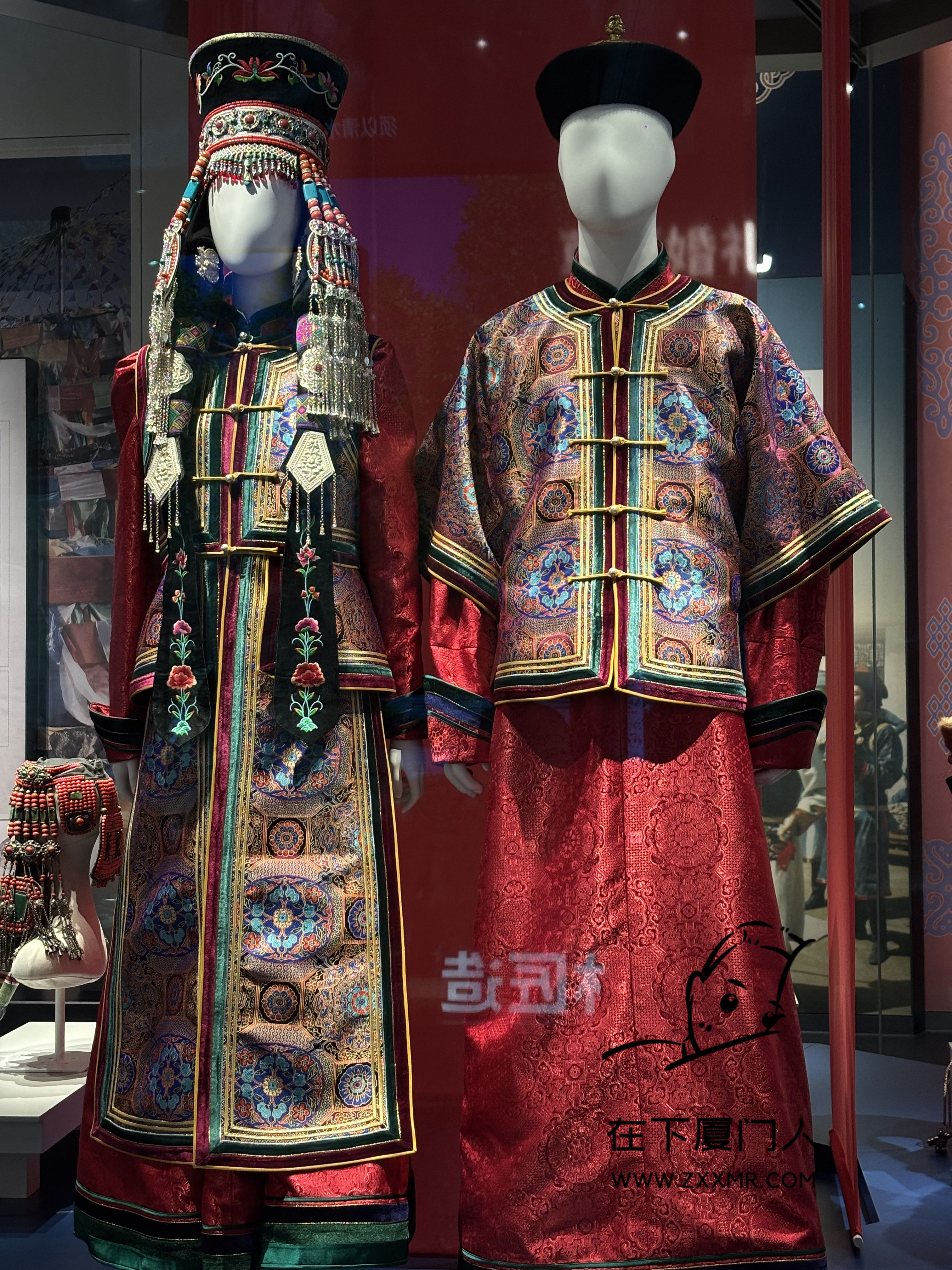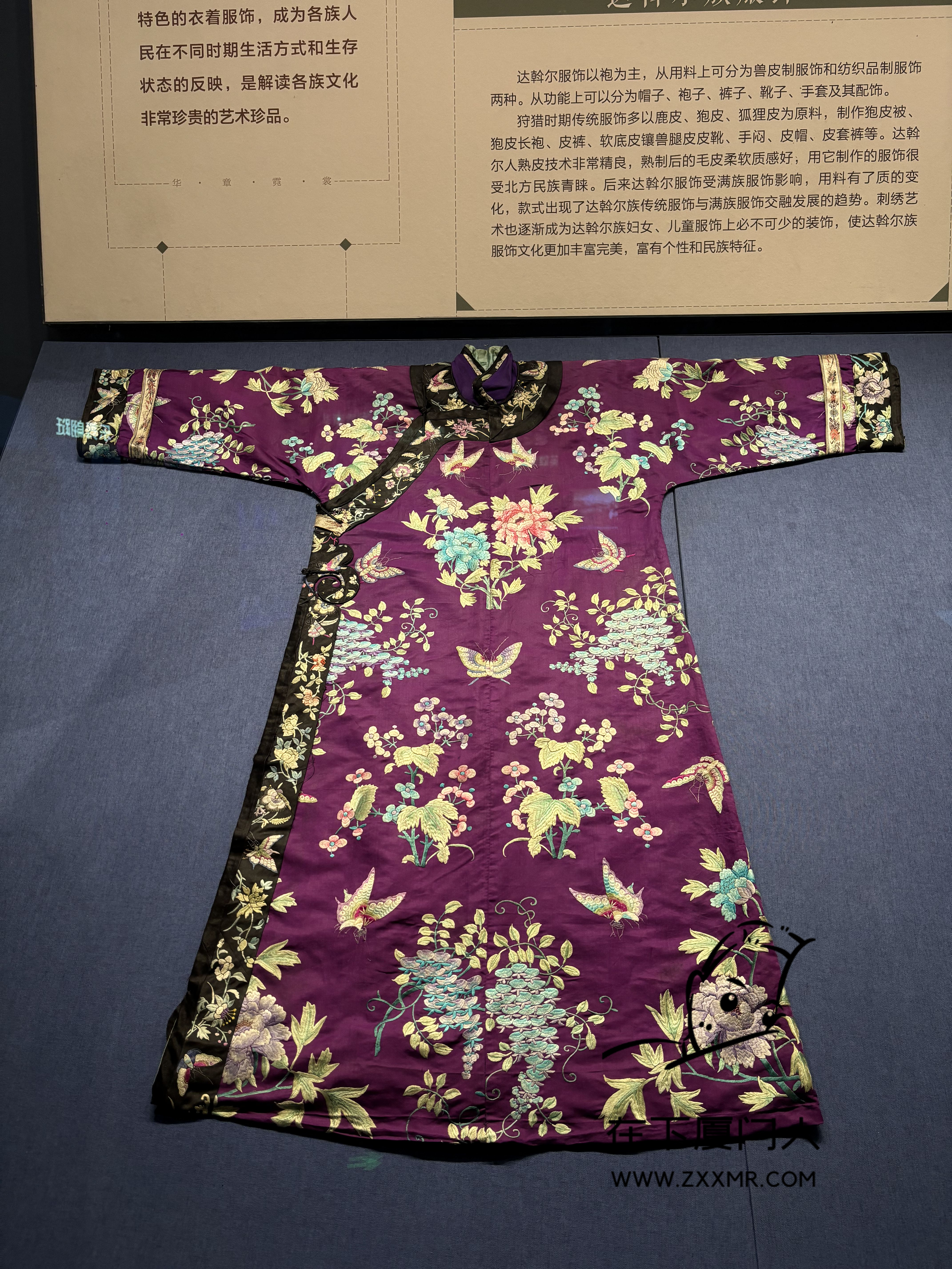 达斡尔族深藕荷绸彩绣蝶恋花立领右衽宽边如意纹女袍
