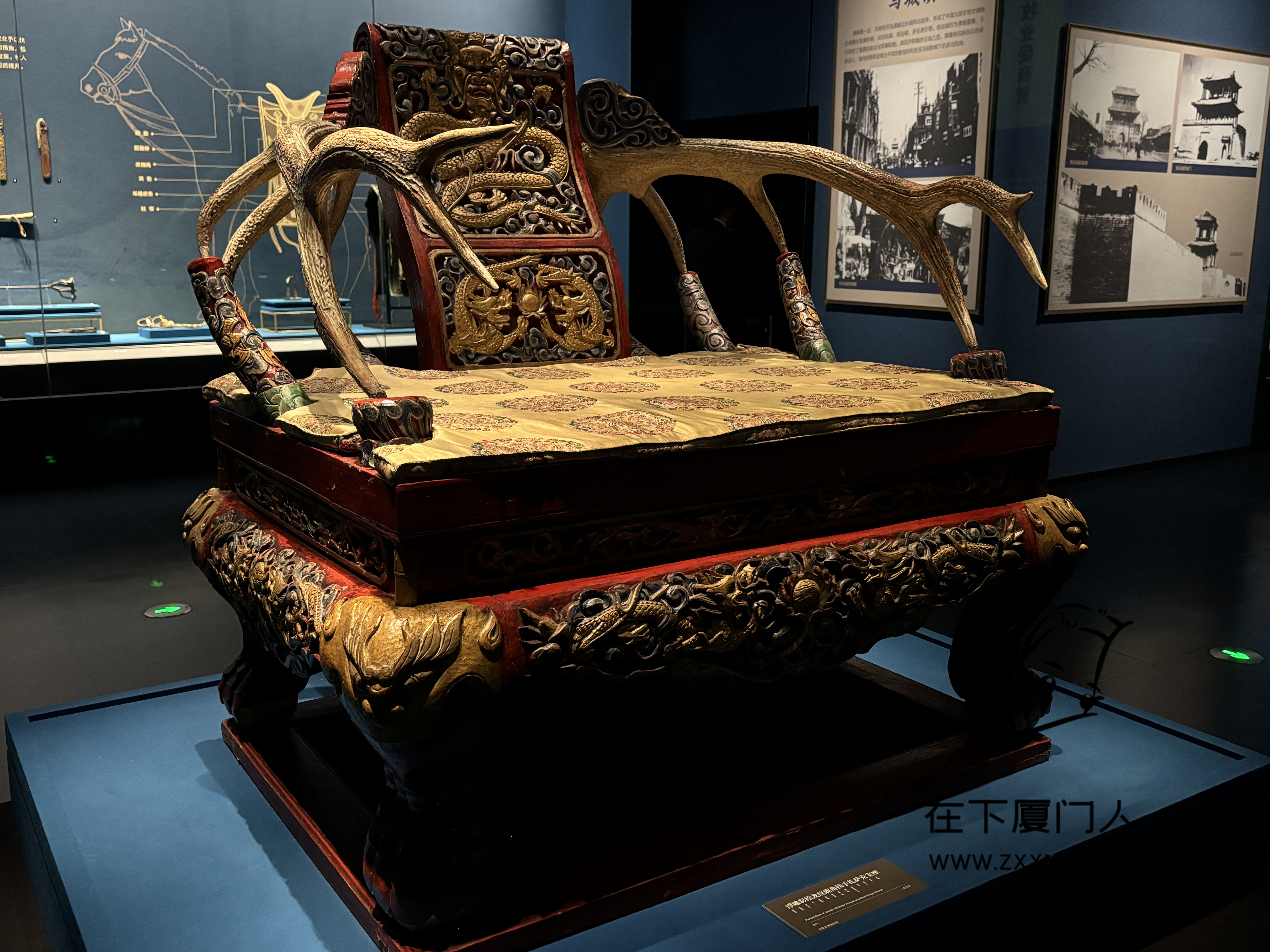 浮雕彩绘龙纹鹿角扶手扎萨克宝座(清代、一级文物、内蒙古博物院藏)