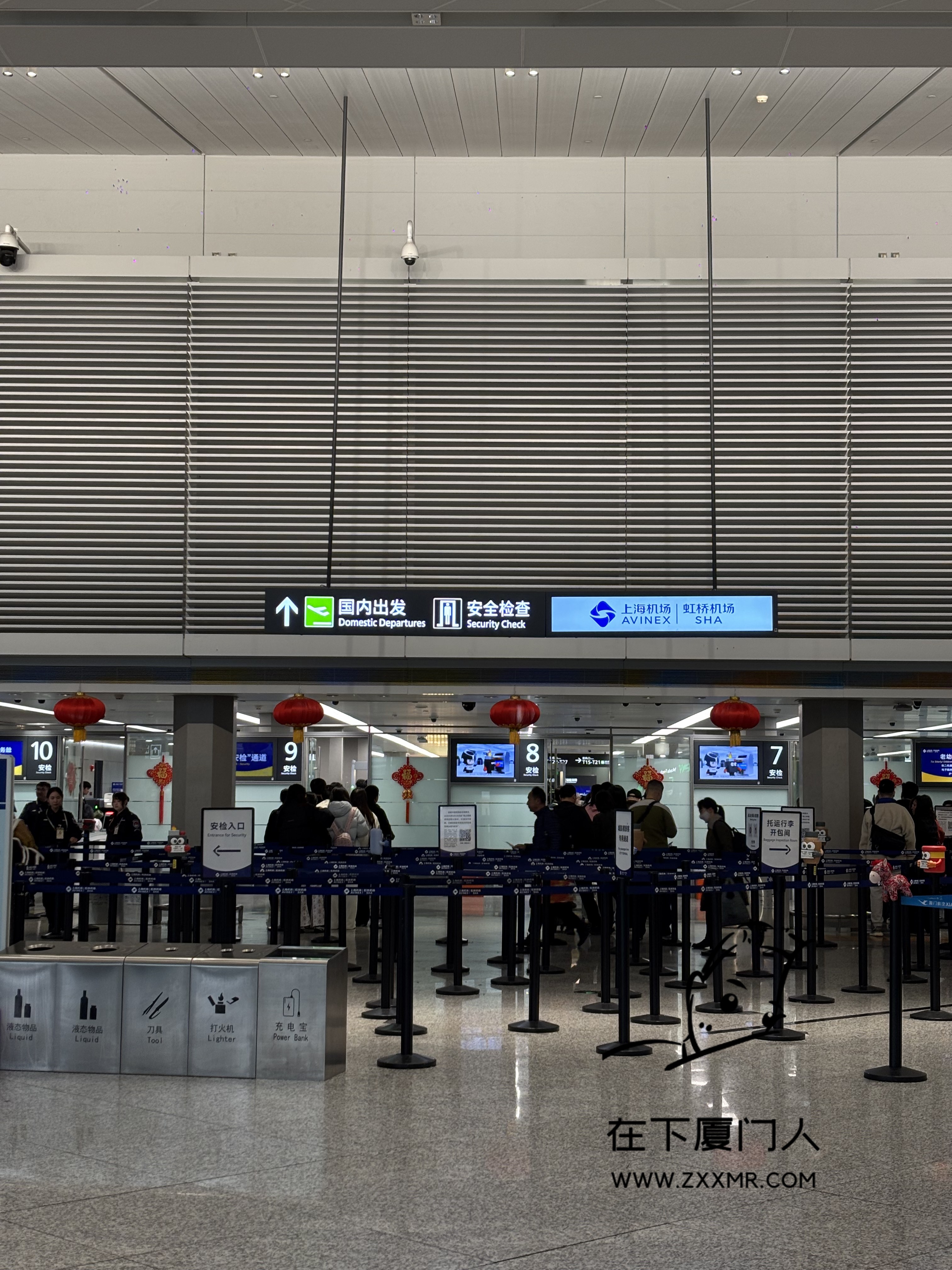 虹桥T1航站楼国内安检区排队人数也不多,比日常清晨早高峰的时刻少多了。