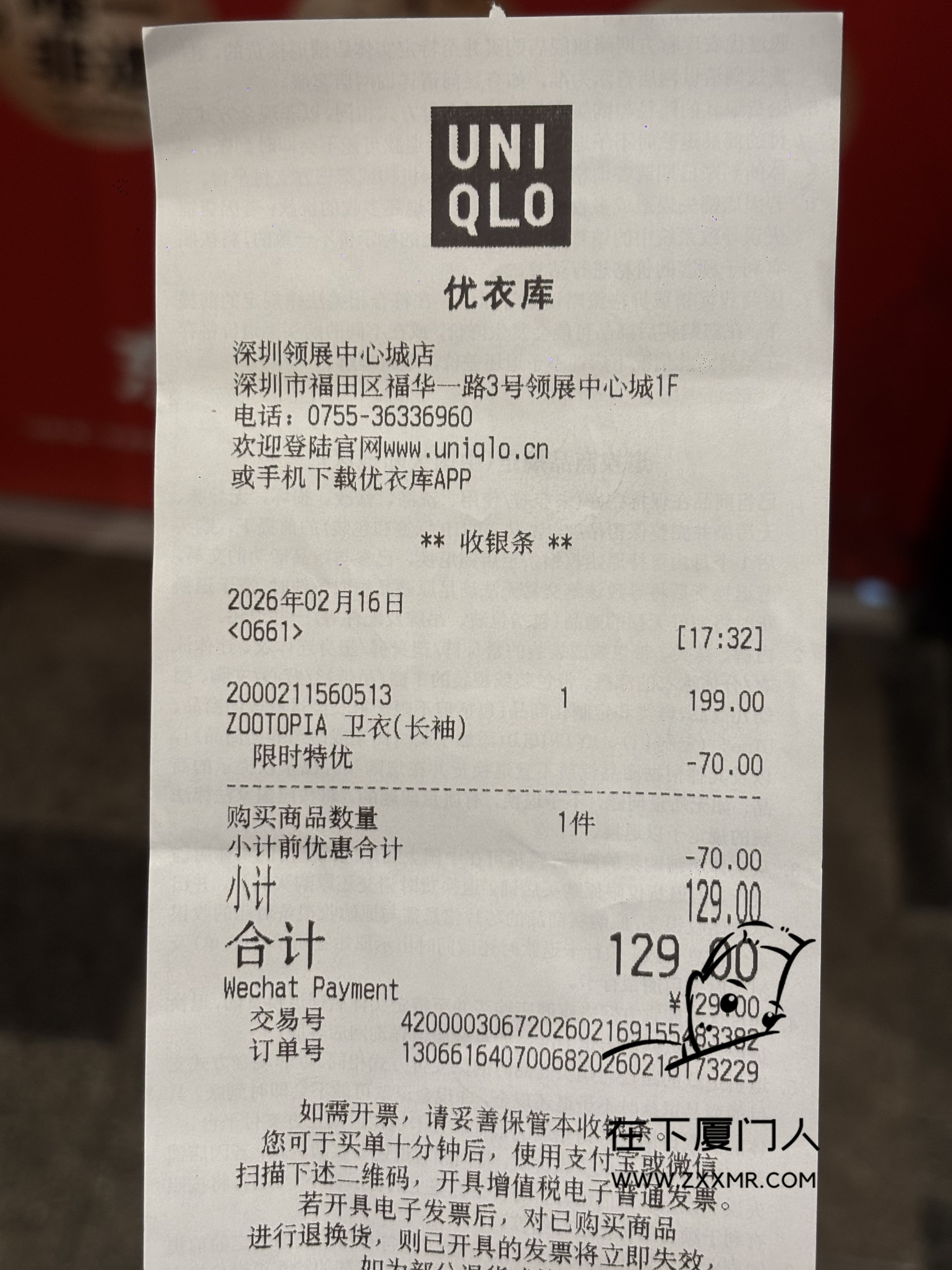 在福田高铁站斜对面的领展中心商场的优衣库买了一件卫衣,花了129元。本来想着买个短袖的,但携带的双肩包已经塞满了东西,羽绒服和保暖内衣塞不下,且不会携带到香港,又担心在香港的夜晚会有点冷,随即买的长袖卫衣。